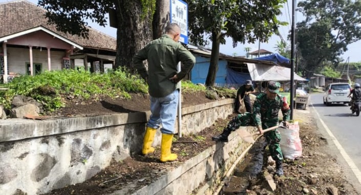 Babinsa Desa Cibeureum Laksanakan Karya Bakti Pembersihan Selokan Bersama Warga