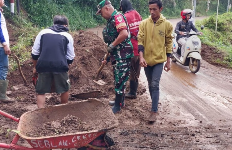 Babinsa Desa Sukaresmi Laksanakan Karya Bakti Pembersihan Tanah yang Menutupi Jalan