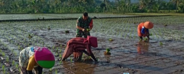 “Babinsa Desa Sukamanah Turun Tangan, bantu kelompok Tani tanam Padi di Kampung Sukatani”