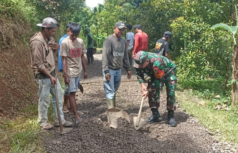 Babinsa Desa Cibadak dari Koramil 0608-03/Cibeber Lakukan Karya Bakti Pengaspalan Jalan