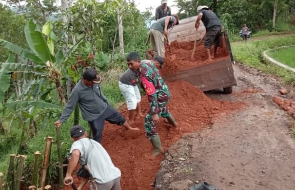 Babinsa Desa Sukasari Lakukan Karya Bakti Perbaikan Jalan
