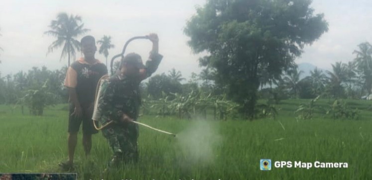 Babinsa Desa Sukajaya Lakukan Pendampingan Perawatan dan Penyemprotan Padi
