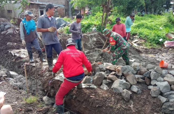 Babinsa Desa Sinarbakti Lakukan Karya Bakti Pembuatan Tanggul Selokan Air